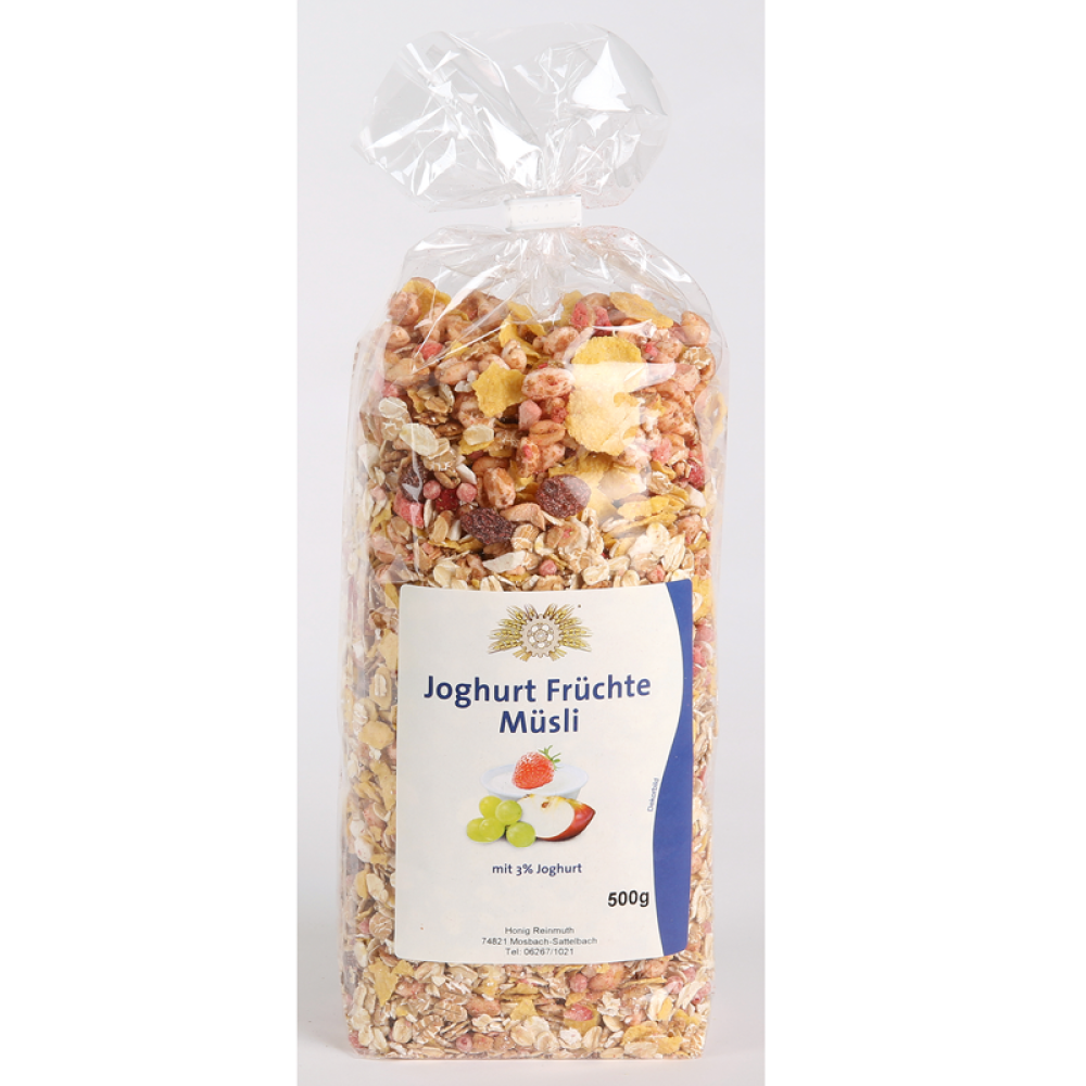 Müsli mit 19% Trockenfrüchten und 3% Joghurt-Trockenanteil.