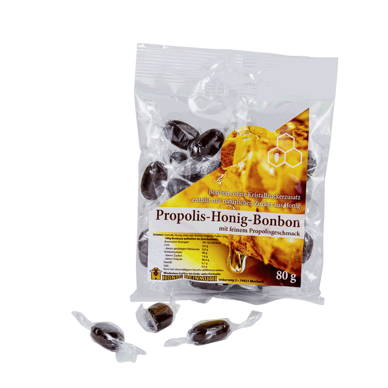 Honig-Propolis-Bonbons, ohne Kristallzucker - mit feinem Propolis Geschmack. Nur beste Zutaten werden verwendet: Isomalt, Honig und echtes Propolis-Pulver.
